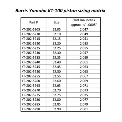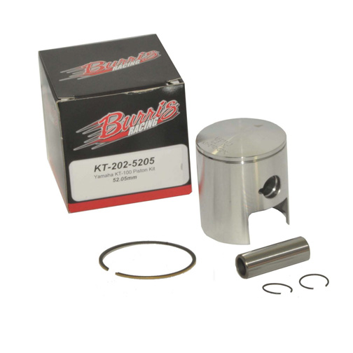 Burris KT-100 52mm Yamaha Piston Kit – The Burris piston for the Yamaha KT-100 is a completely unique design as compared to other makes. The ring location has been moved up the piston to isolate the exhaust flame and reduce expansion. The high silicon content alloy is specially run just for Burris. This alloy has superior strength, minimal expansion and reduced friction properties making it a perfect match for today’s high revving 2-Cycle engines. Additionally, we have a different shape utilizing less cam and taper in the piston which requires slightly more skirt clearance but produces more low end torque without sacrificing top end RPM’s. (TiN ring, wrist pin and clips included)